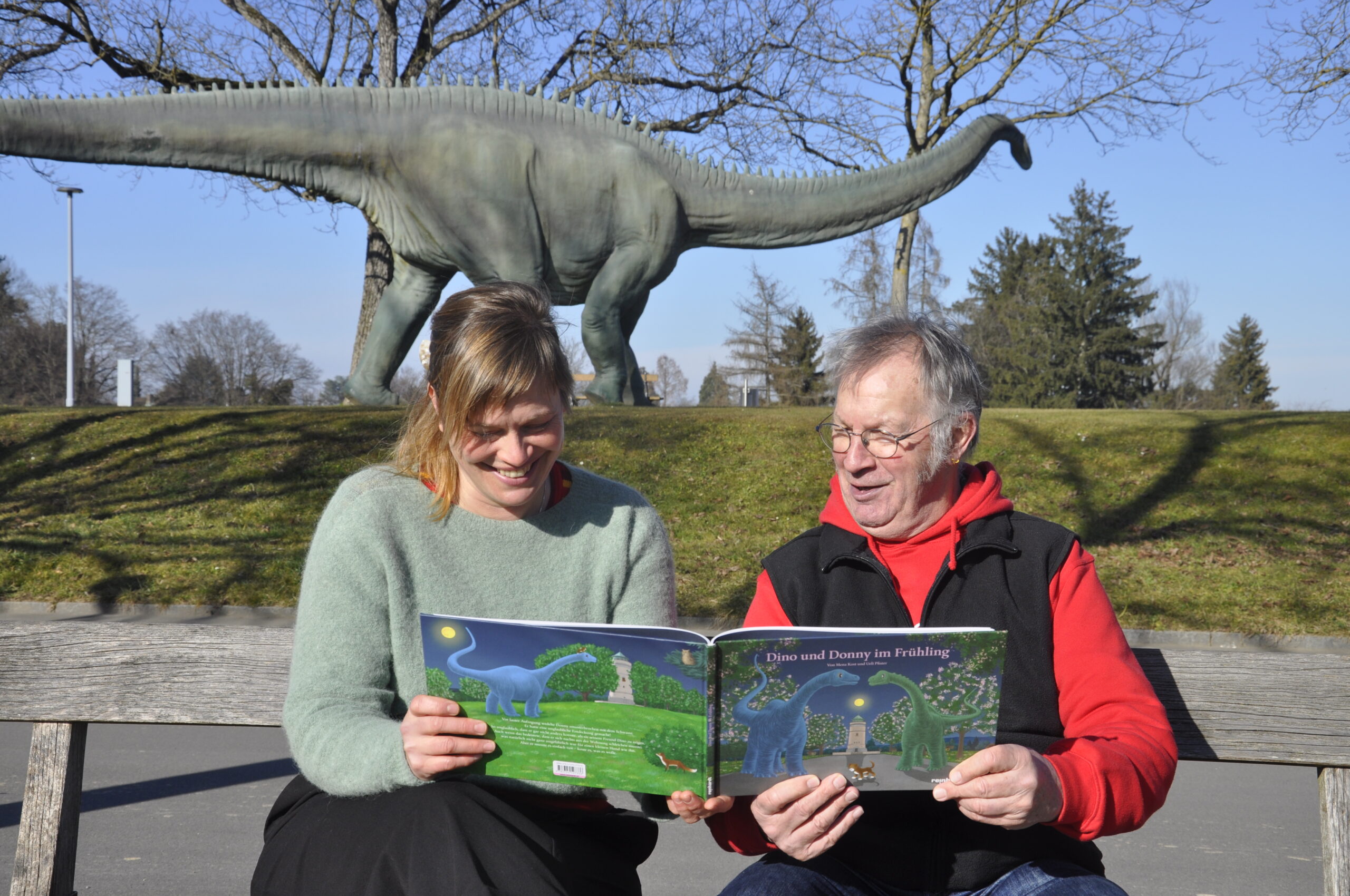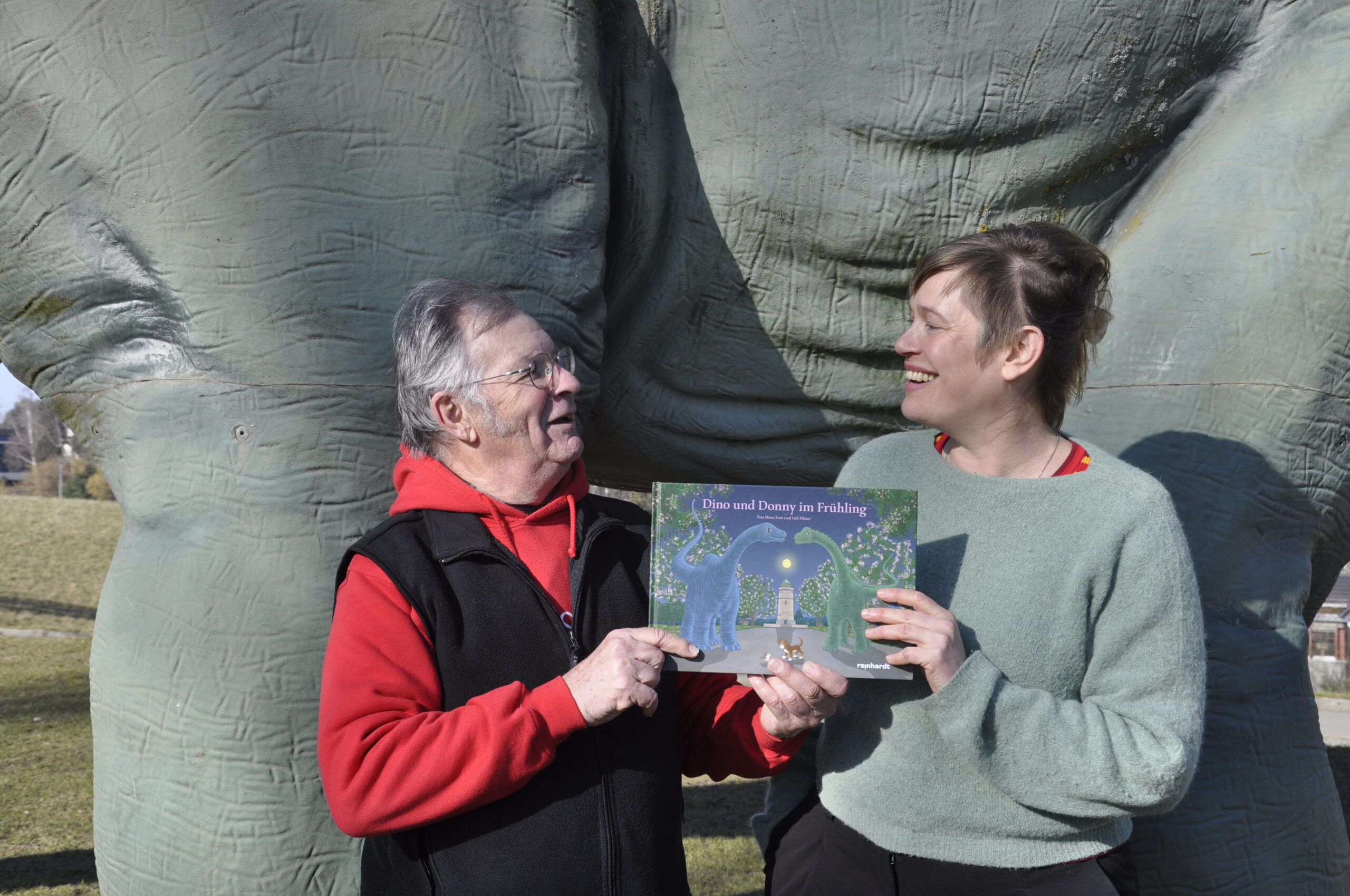 Illustrator Ueli Pfister und Autorin Mena Kost erzählen das Baselbilderbuch «Dino und Donny im Frühling» und signieren Bücher