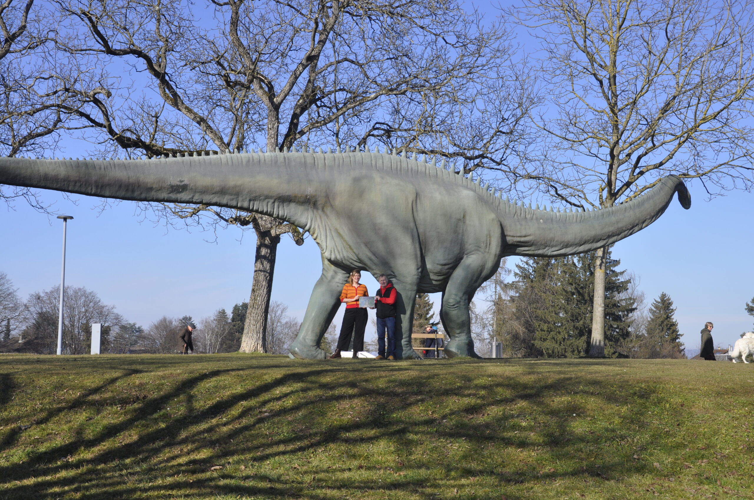 Kinderlesung mit Autorin Mena Kost und Illustrator Ueli Pfister auf dem Bruderholz. Anschliessend Dina-Besichtigung und Dino-Zvieri